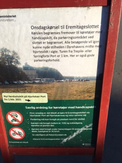 Kørslen begrænses fremover til køretøjer med handicapskilt, da parkeringsområdet ved slottet er begrænset. Alle besøgende vil igen kunne nyde stilheden i Dyrehavens midte med hjortvildt i sigte. Turen fra Trepile – eller Springforbi Port er 1 km. Her er også gode parkeringsforhold.